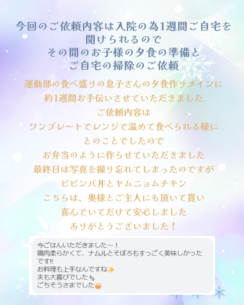 今回は、約1週間分の夕食の準備とお掃除のご依頼です!